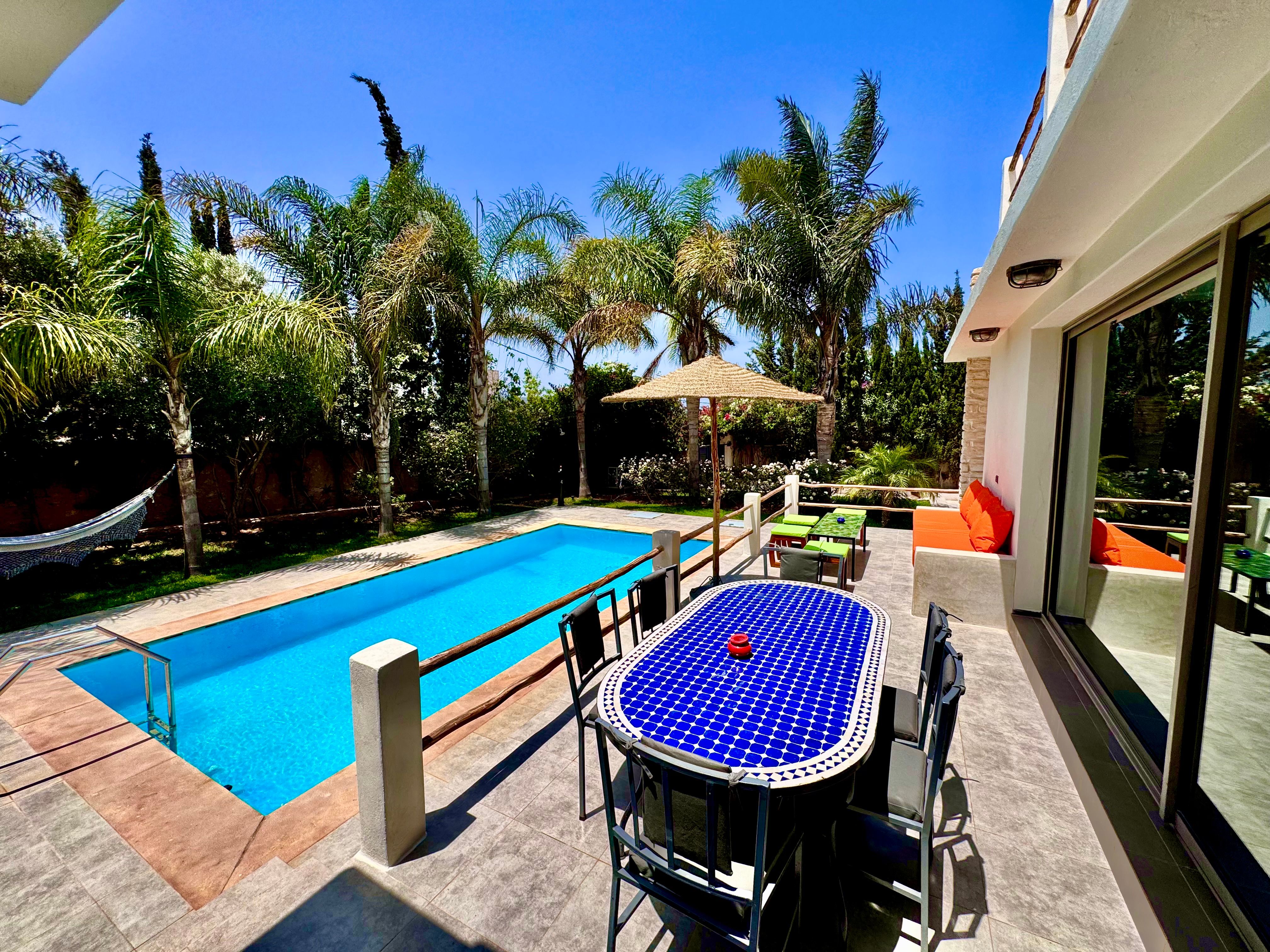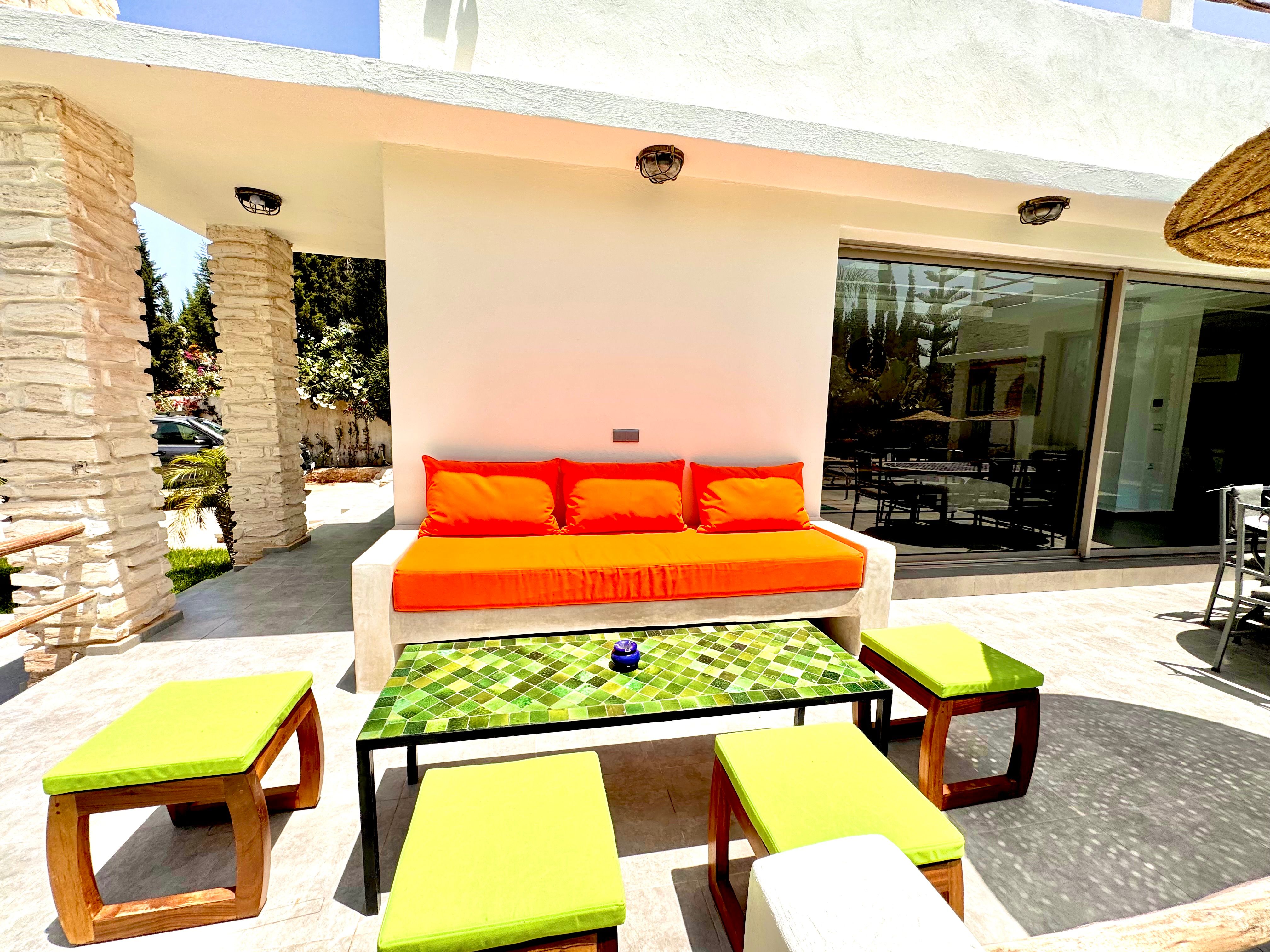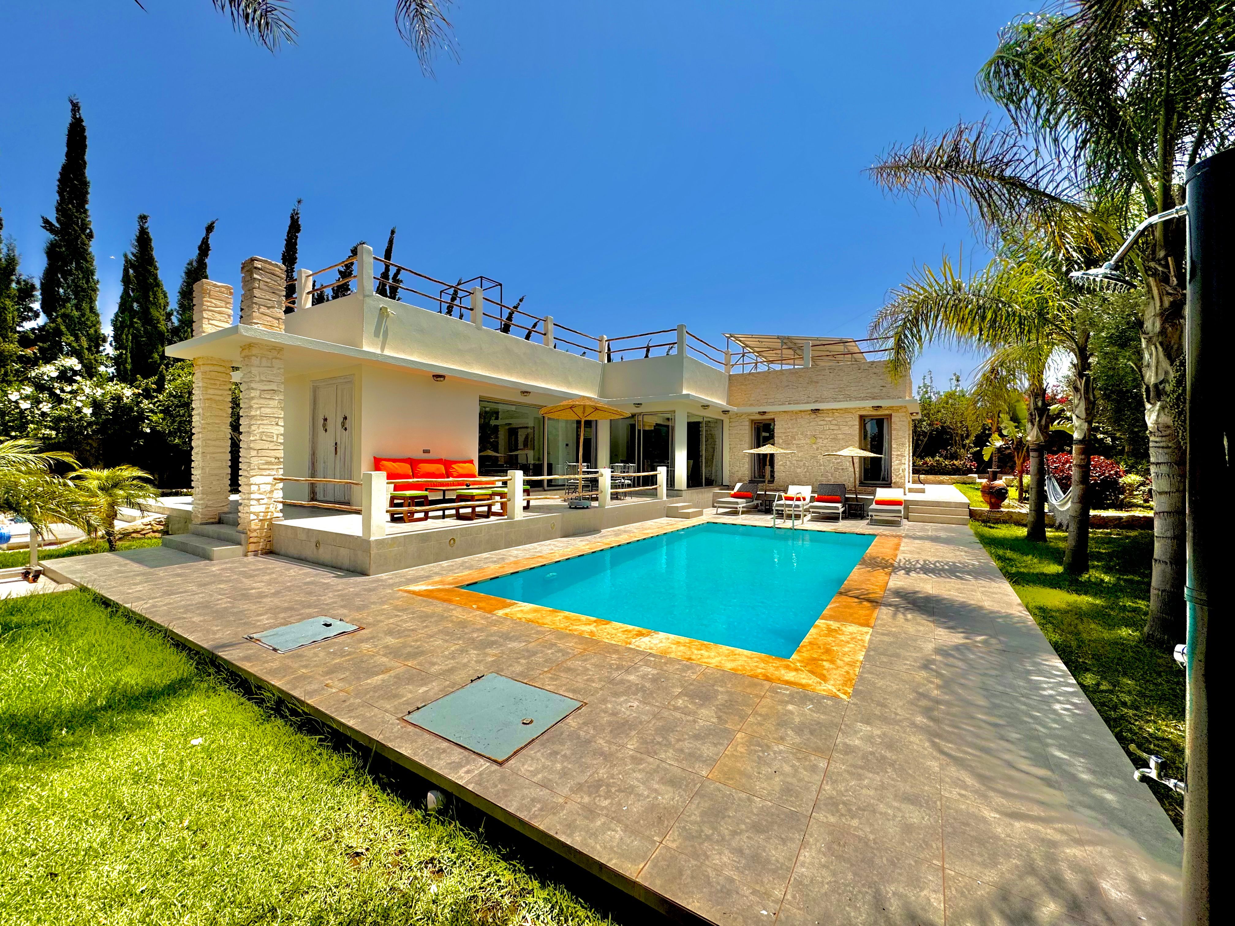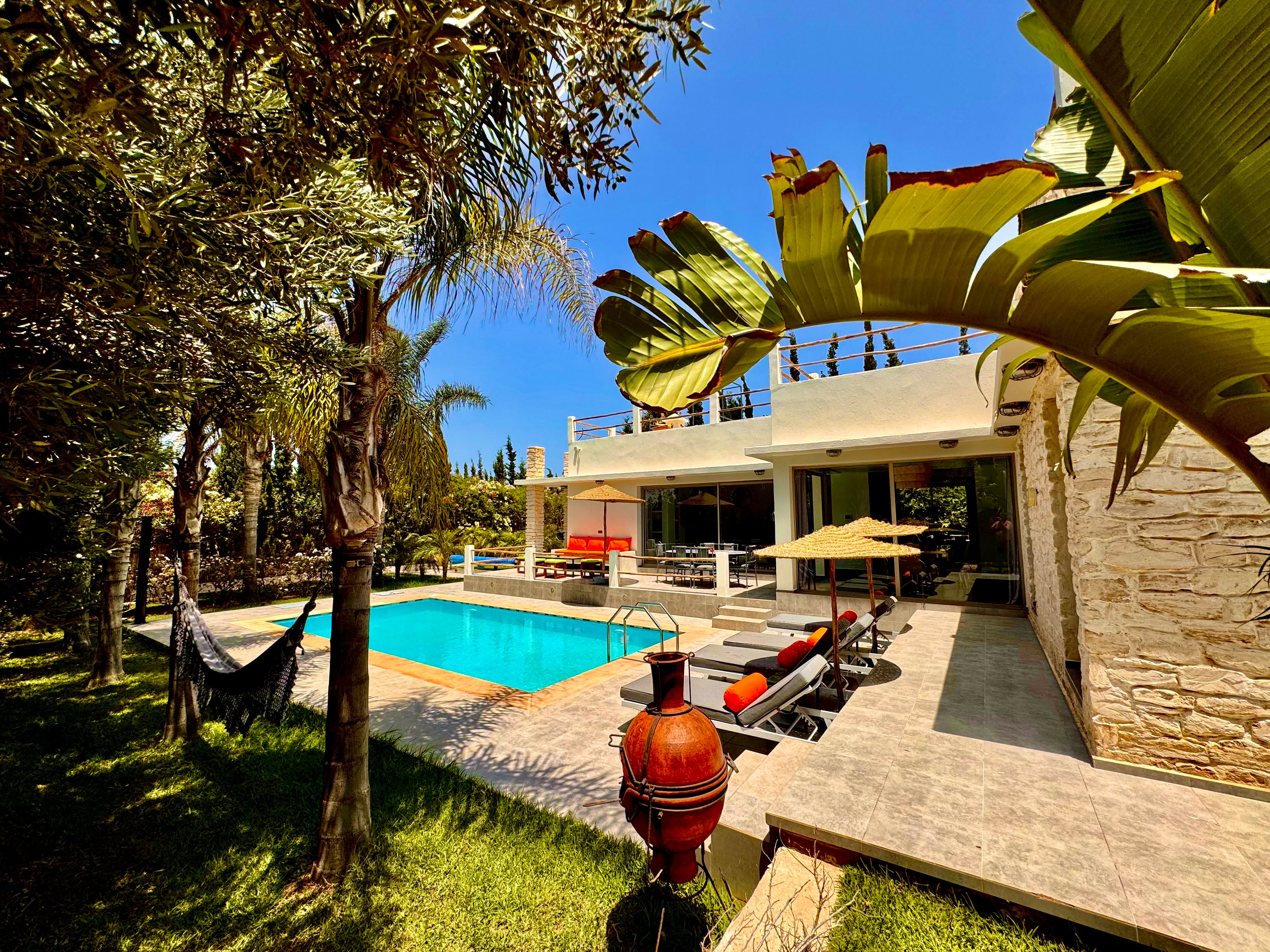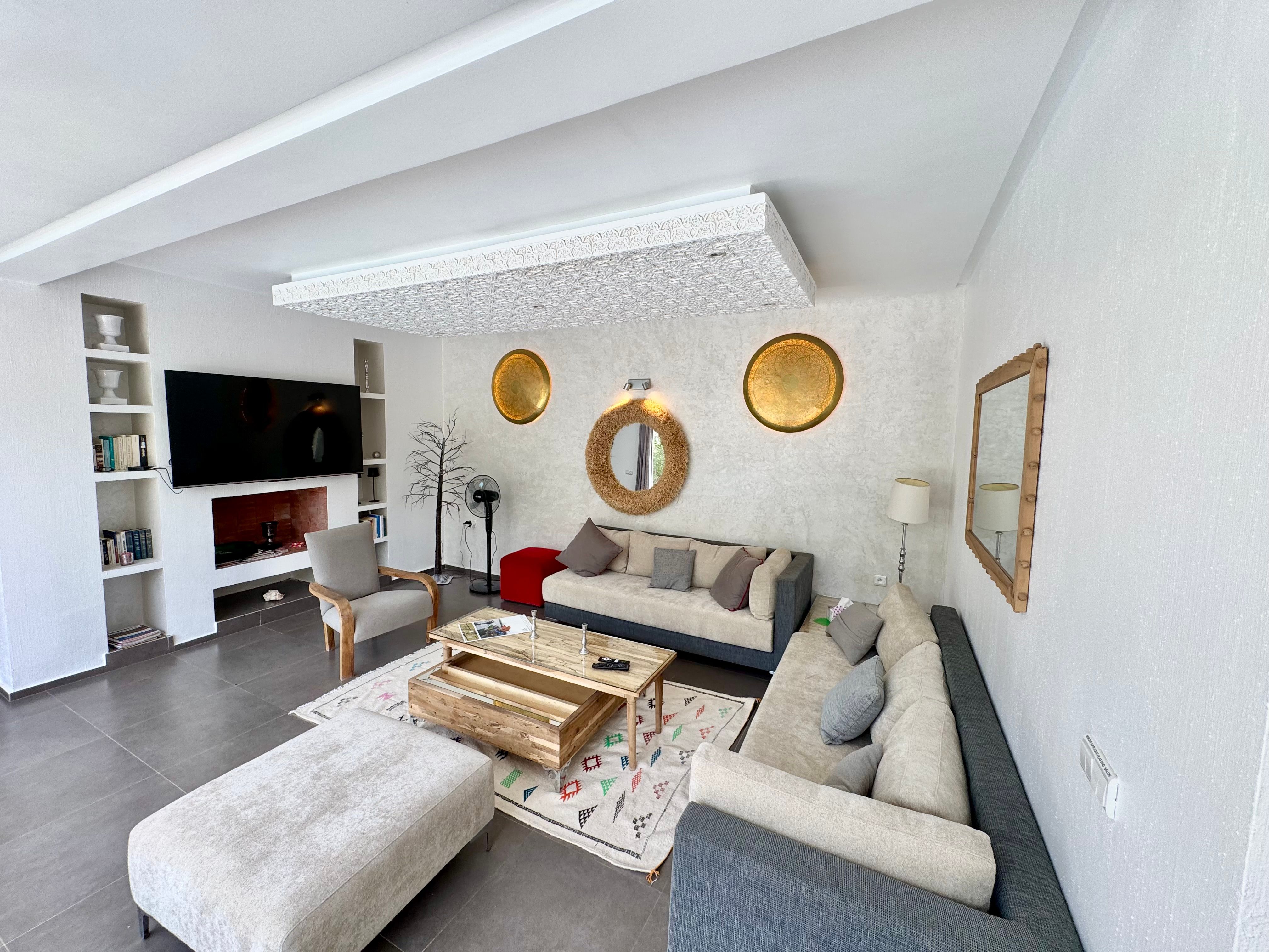 La Villa Mila à Essaouira est un hébergement de luxe et tout confort pour 6 personnes au cœur d'un jardin luxuriant, 3 chambres climatisées avec Tv satellite, 3 salles de bain, 4 WC, une cuisine super équipée et un salon moderne avec cheminée et télé multicanaux, Netflix... Elle offre un cadre idéal pour des familles ou des groupes d'amis avec des services complémentaires comme le ménage, les petits déjeuners, cuisine, massages à domicile, parking gratuit, et un accès proche des plages et des atmosphères magiques de la Médina: ses habitants, ses couleurs, ses restaurants, son artisanat, son port de pêche… et ses activités: golf, padel, kite surf, équitation, quad, excursions 4x4 et Renault4, hammams...