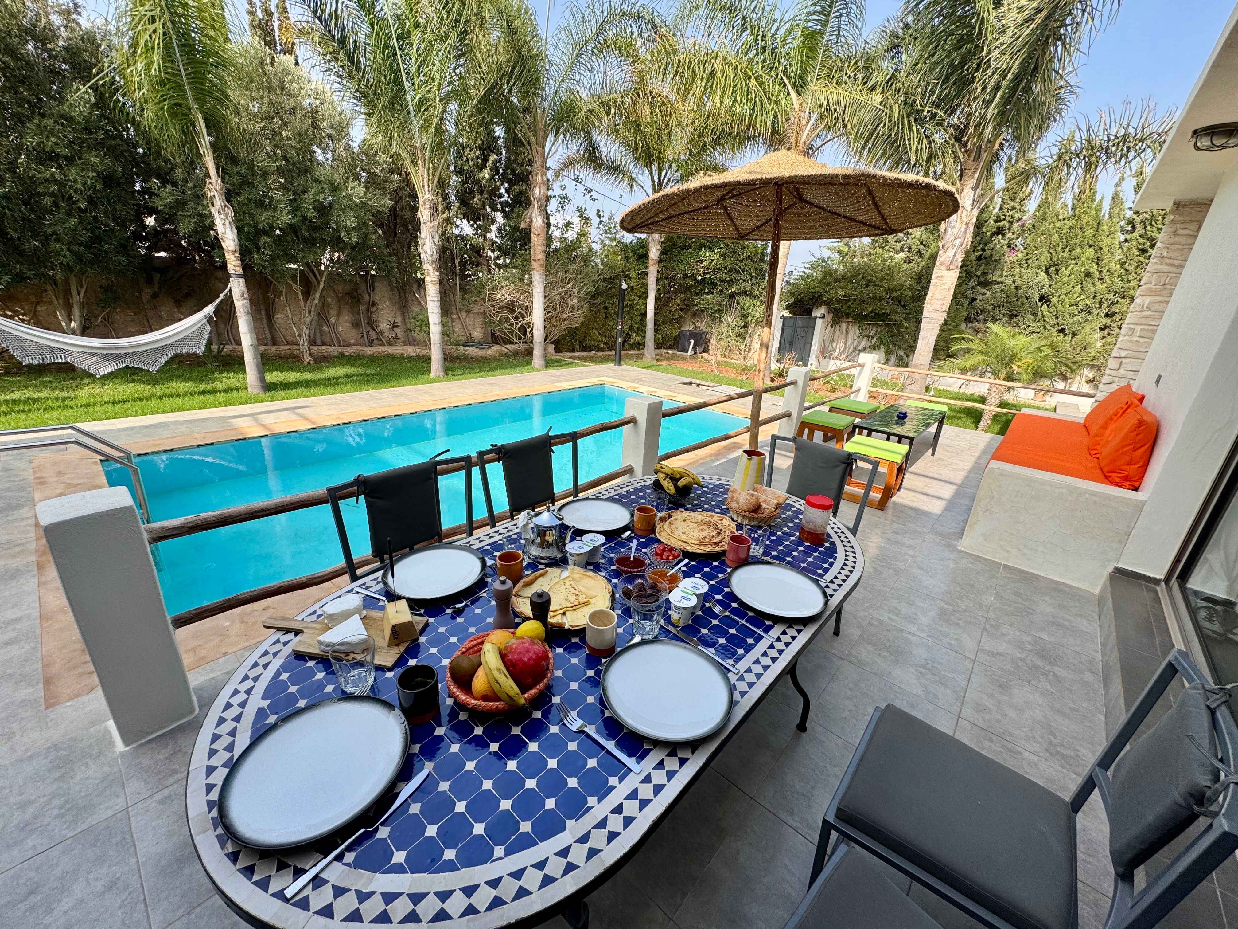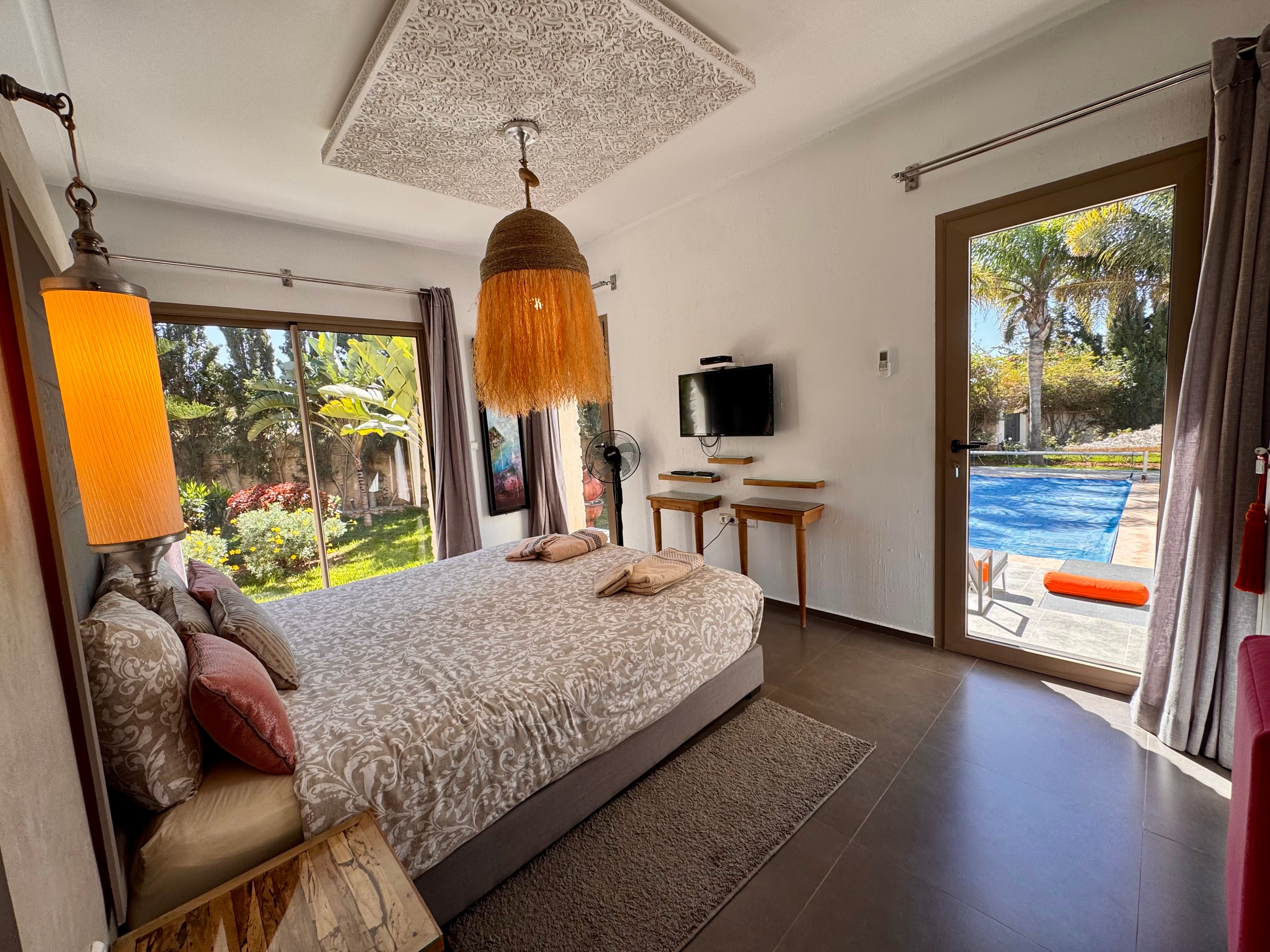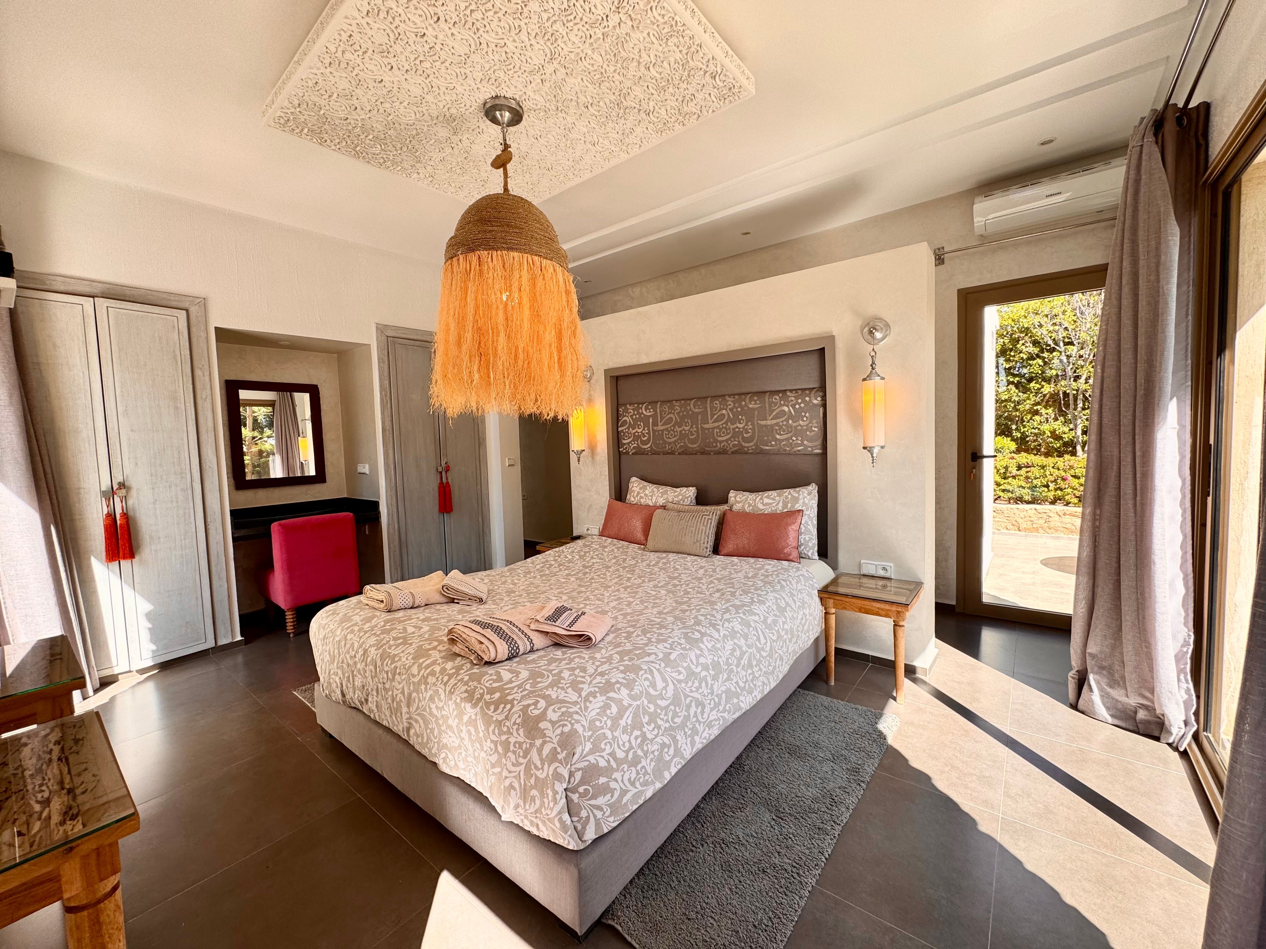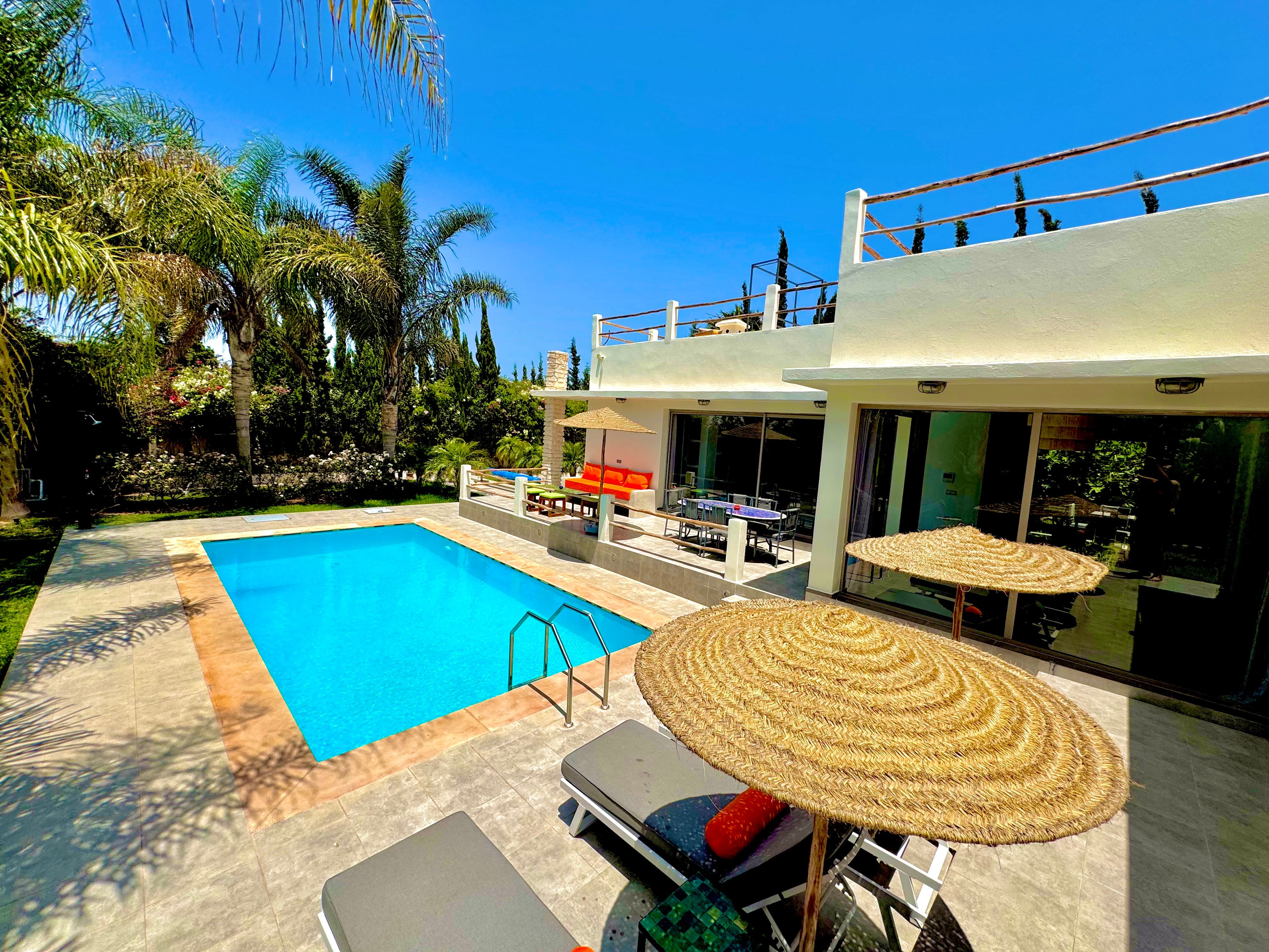 La Villa Mila à Essaouira est un hébergement de luxe et tout confort pour 6 personnes au cœur d'un jardin luxuriant, 3 chambres climatisées avec Tv satellite, 3 salles de bain, 4 WC, une cuisine super équipée et un salon moderne avec cheminée et télé multicanaux, Netflix... Elle offre un cadre idéal pour des familles ou des groupes d'amis avec des services complémentaires comme le ménage, les petits déjeuners, cuisine, massages à domicile, parking gratuit, et un accès proche des plages et des atmosphères magiques de la Médina: ses habitants, ses couleurs, ses restaurants, son artisanat, son port de pêche… et ses activités: golf, padel, kite surf, équitation, quad, excursions 4x4 et Renault4, hammams...