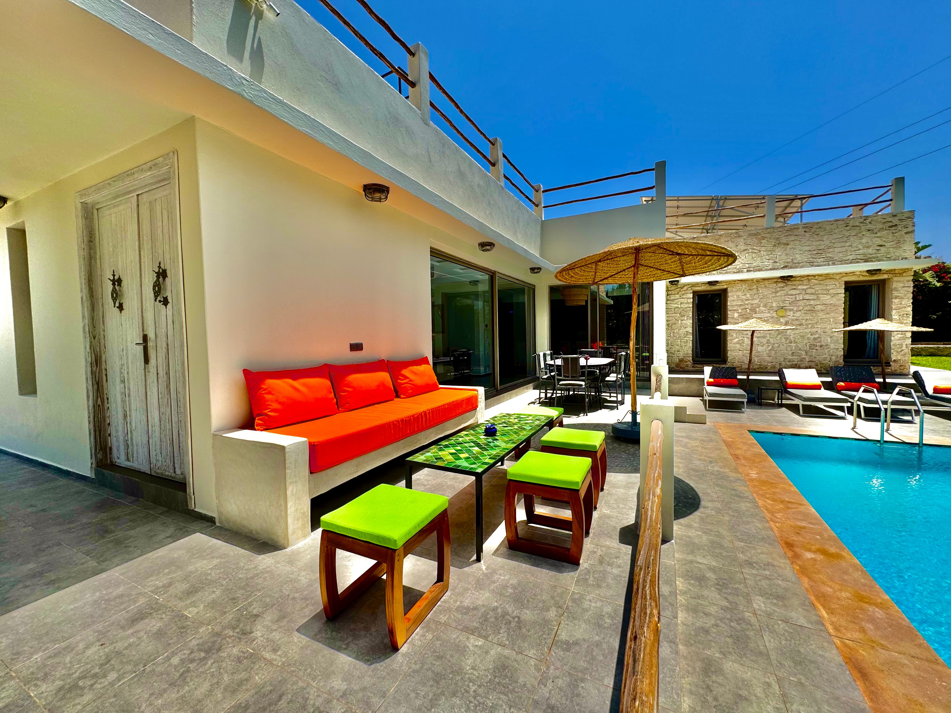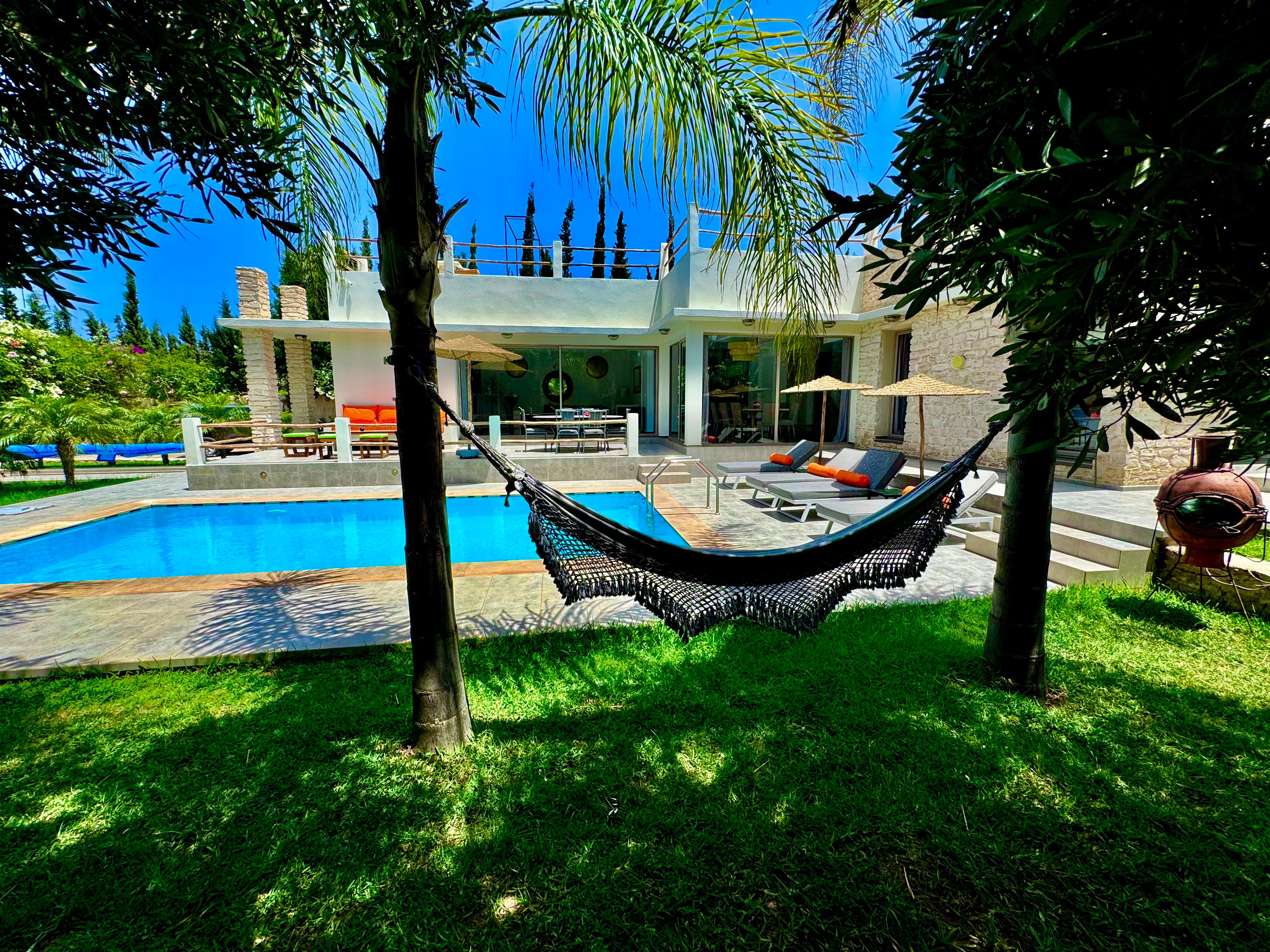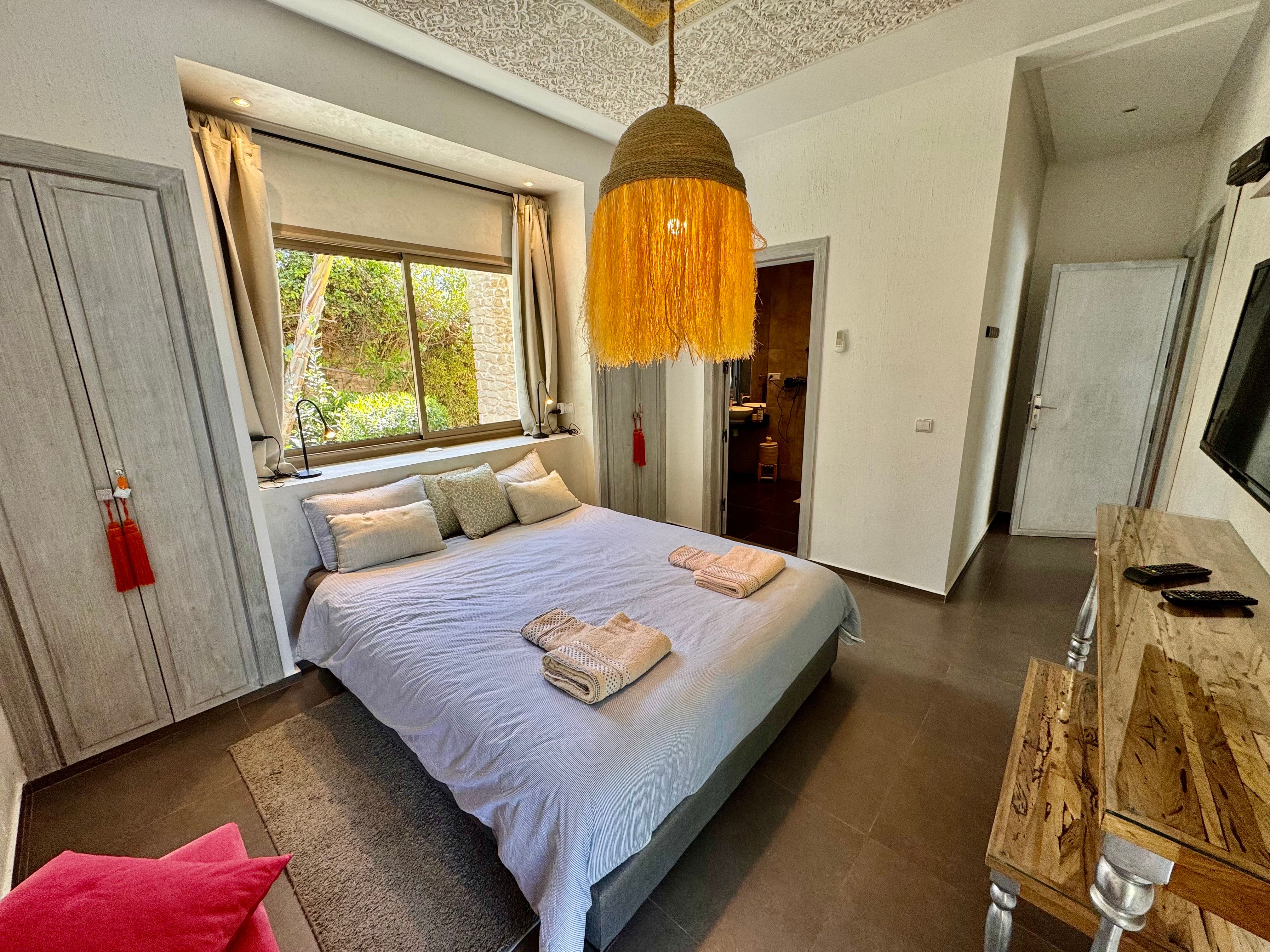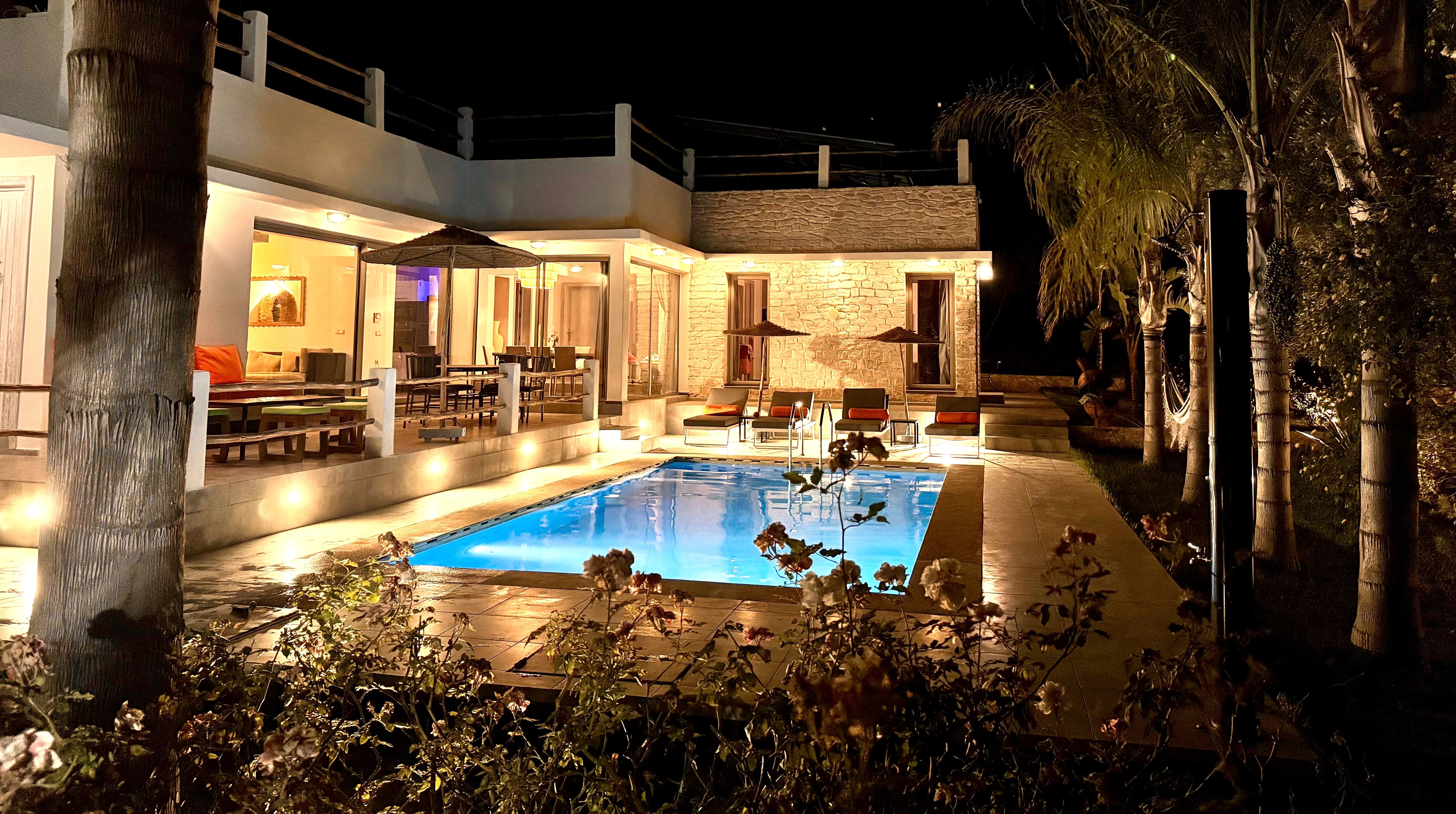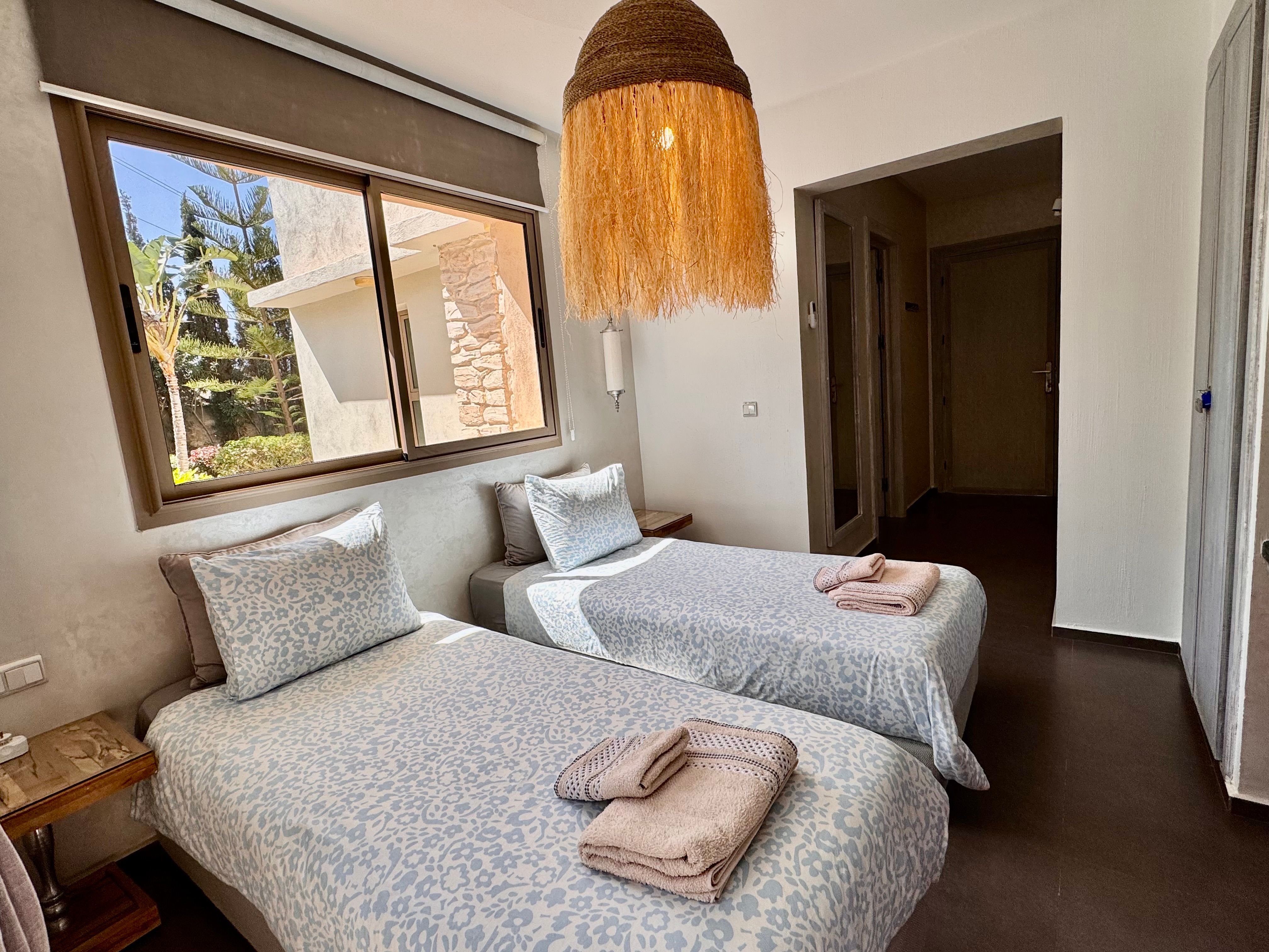 La Villa Mila à Essaouira est un hébergement de luxe et tout confort pour 6 personnes au cœur d'un jardin luxuriant, 3 chambres climatisées avec Tv satellite, 3 salles de bain, 4 WC, une cuisine super équipée et un salon moderne avec cheminée et télé multicanaux, Netflix... Elle offre un cadre idéal pour des familles ou des groupes d'amis avec des services complémentaires comme le ménage, les petits déjeuners, cuisine, massages à domicile, parking gratuit, et un accès proche des plages et des atmosphères magiques de la Médina: ses habitants, ses couleurs, ses restaurants, son artisanat, son port de pêche… et ses activités: golf, padel, kite surf, équitation, quad, excursions 4x4 et Renault4, hammams...