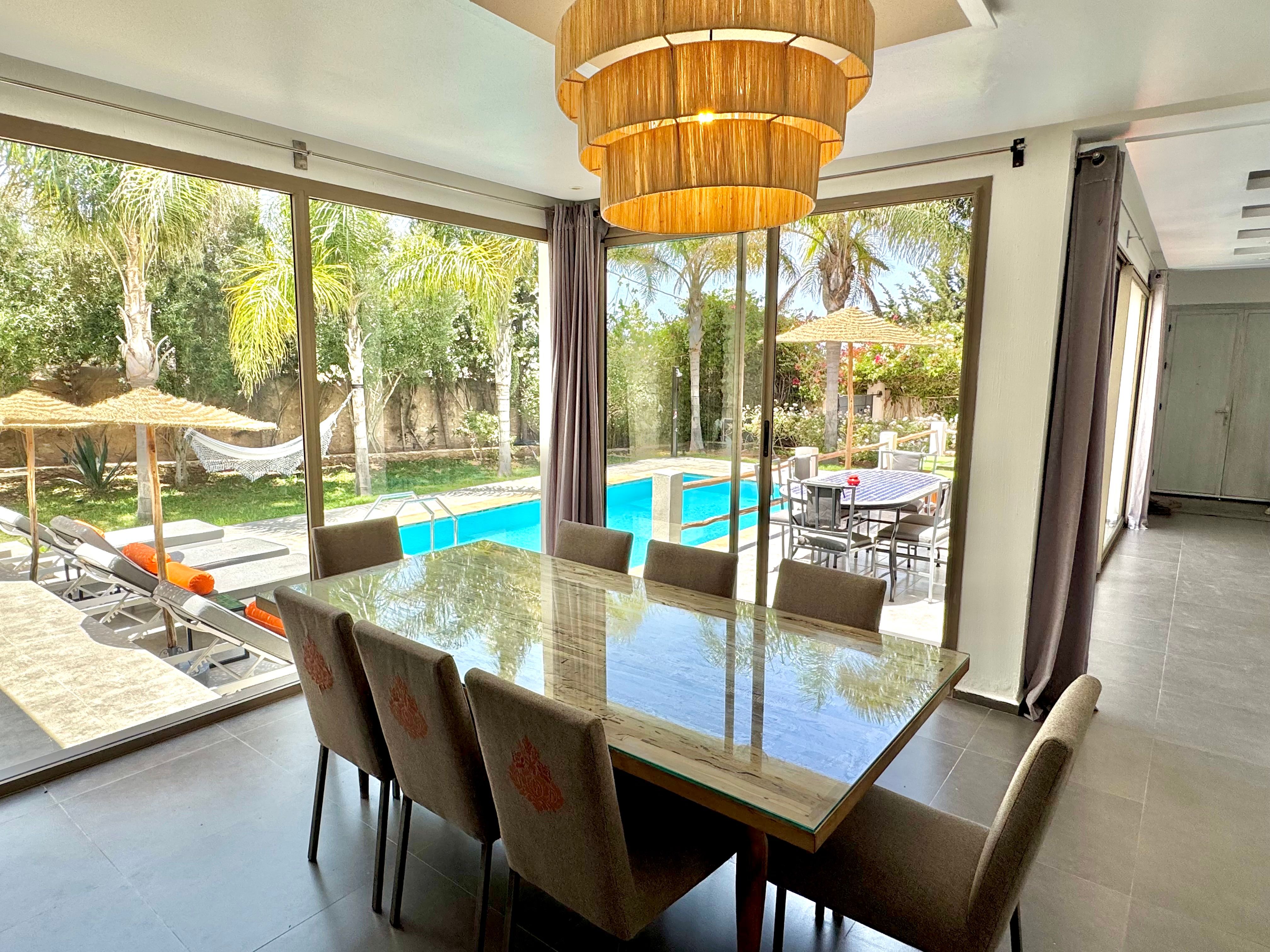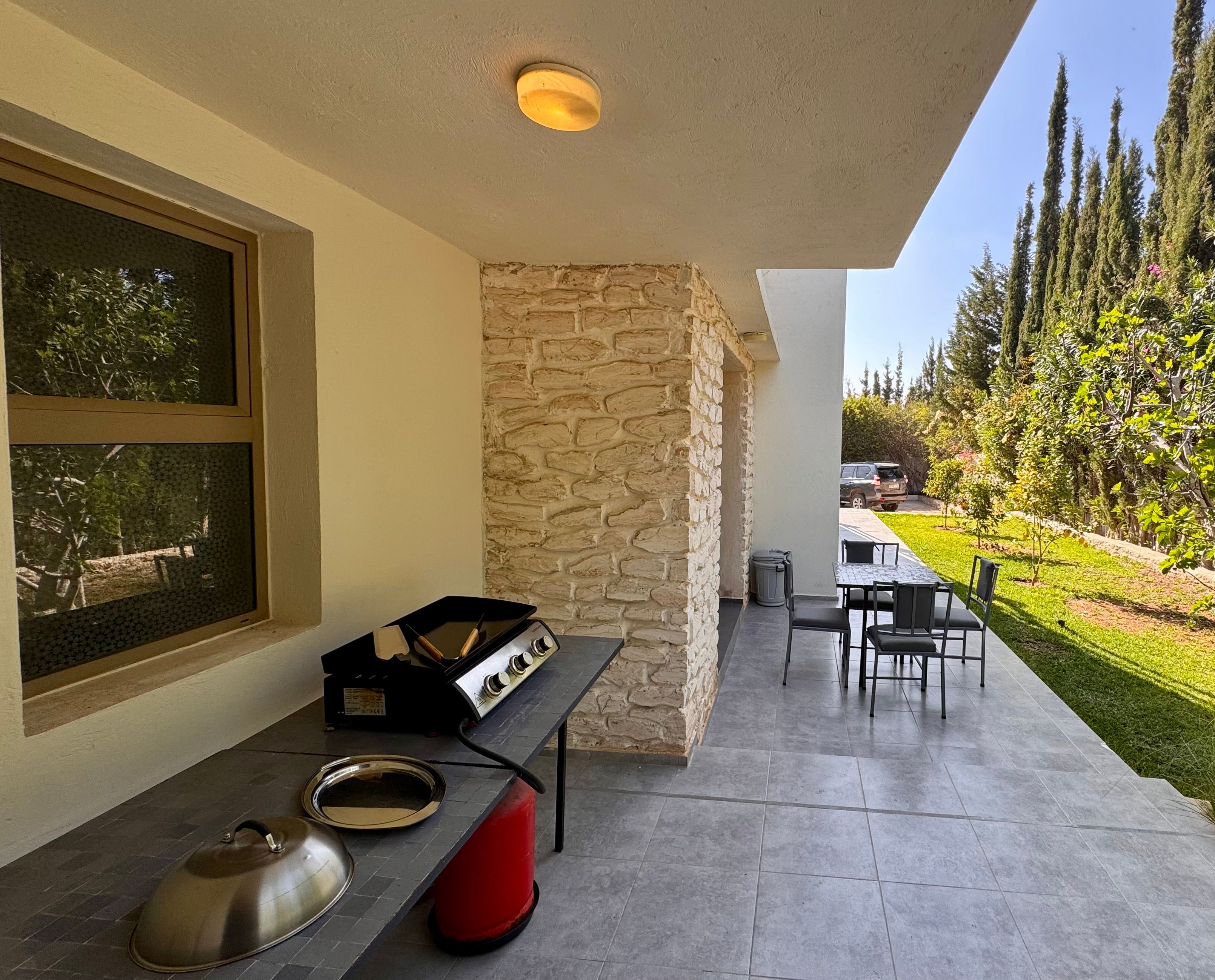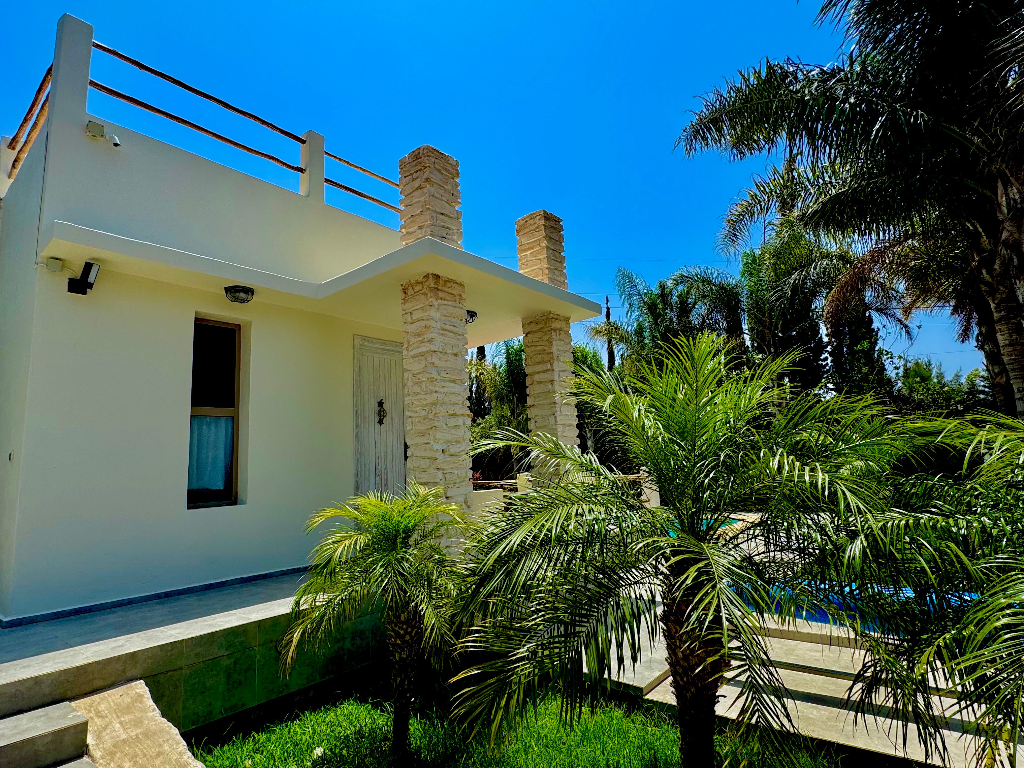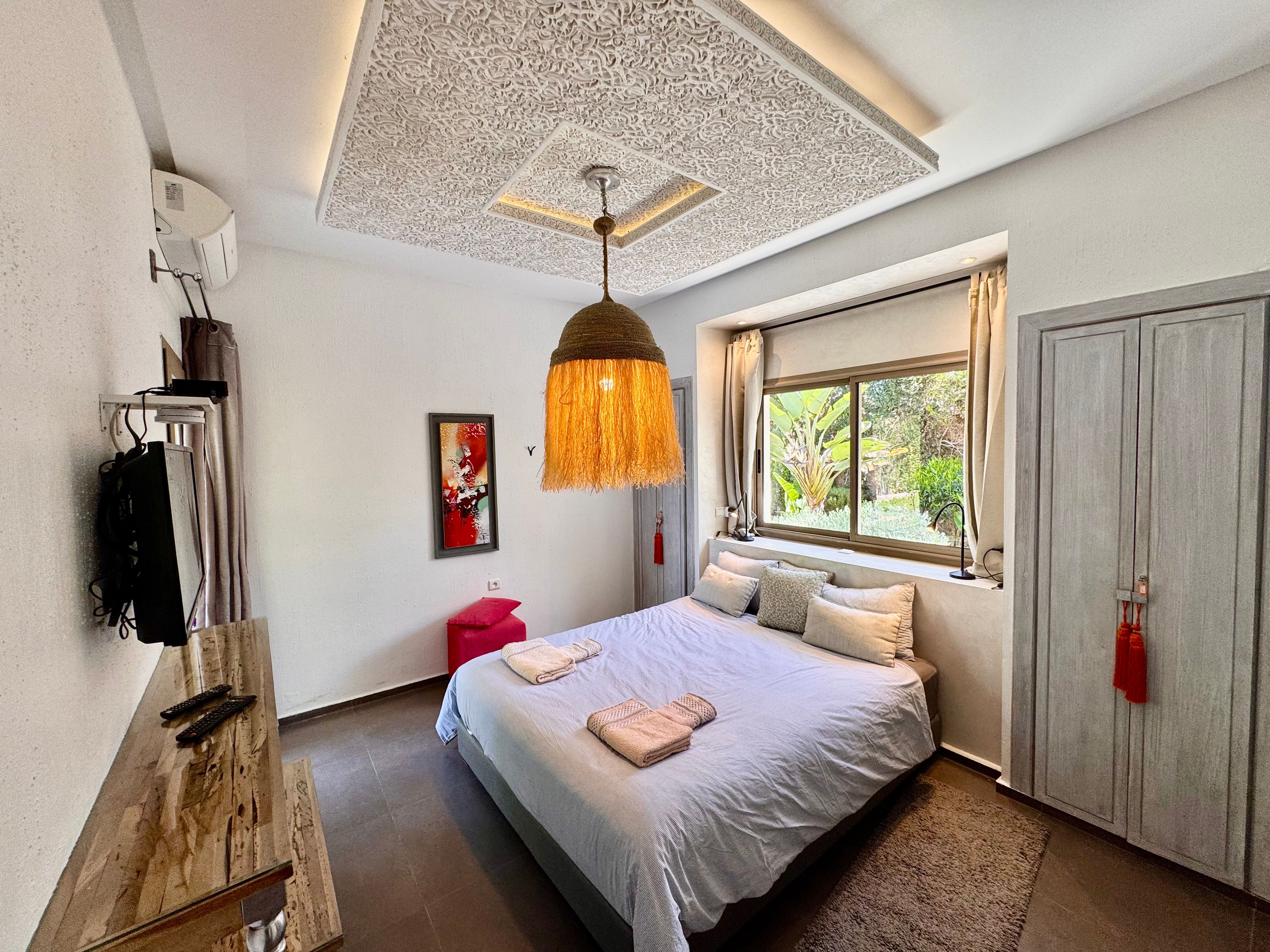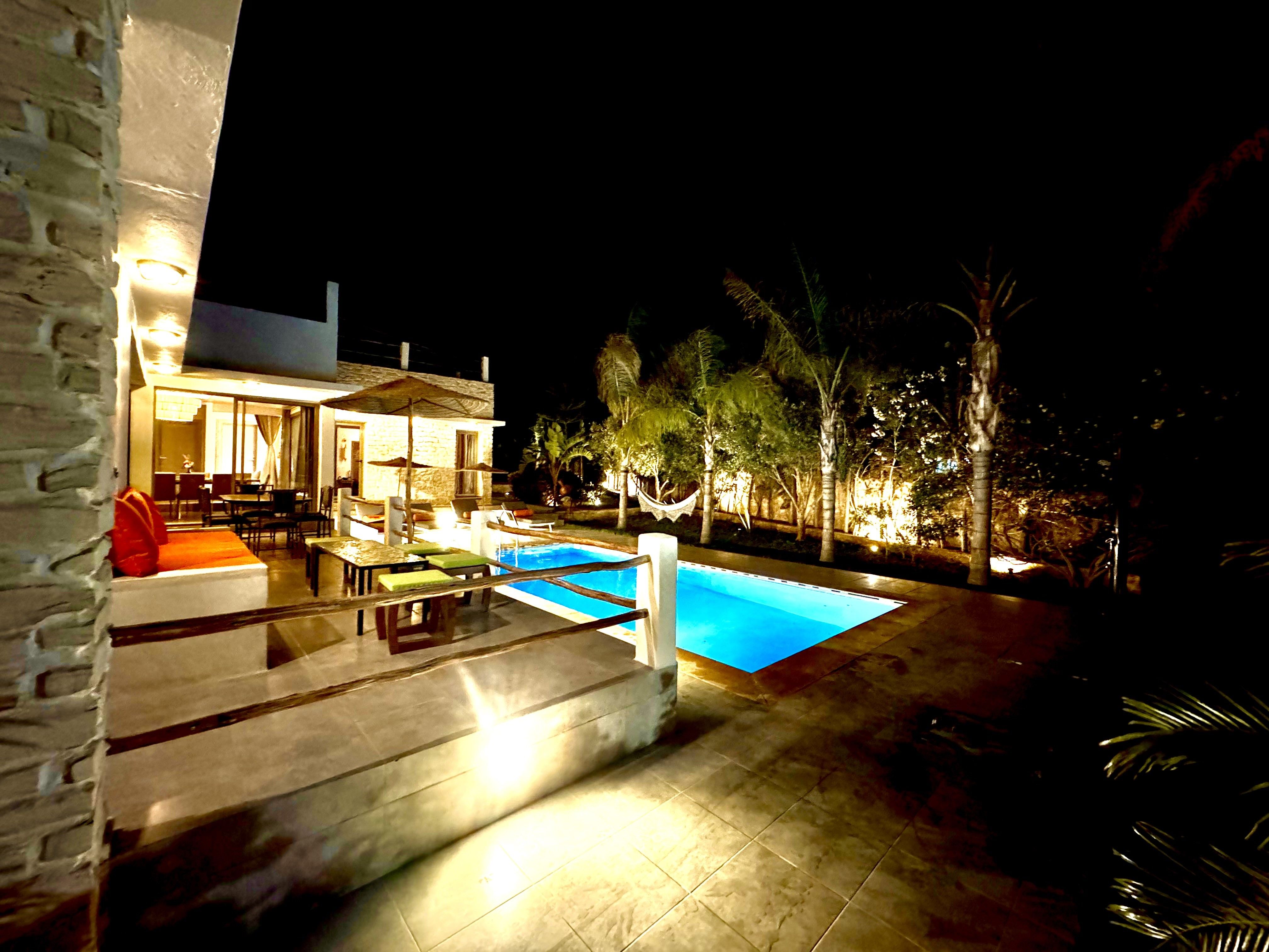 La Villa Mila à Essaouira est un hébergement de luxe et tout confort pour 6 personnes au cœur d'un jardin luxuriant, 3 chambres climatisées avec Tv satellite, 3 salles de bain, 4 WC, une cuisine super équipée et un salon moderne avec cheminée et télé multicanaux, Netflix... Elle offre un cadre idéal pour des familles ou des groupes d'amis avec des services complémentaires comme le ménage, les petits déjeuners, cuisine, massages à domicile, parking gratuit, et un accès proche des plages et des atmosphères magiques de la Médina: ses habitants, ses couleurs, ses restaurants, son artisanat, son port de pêche… et ses activités: golf, padel, kite surf, équitation, quad, excursions 4x4 et Renault4, hammams...