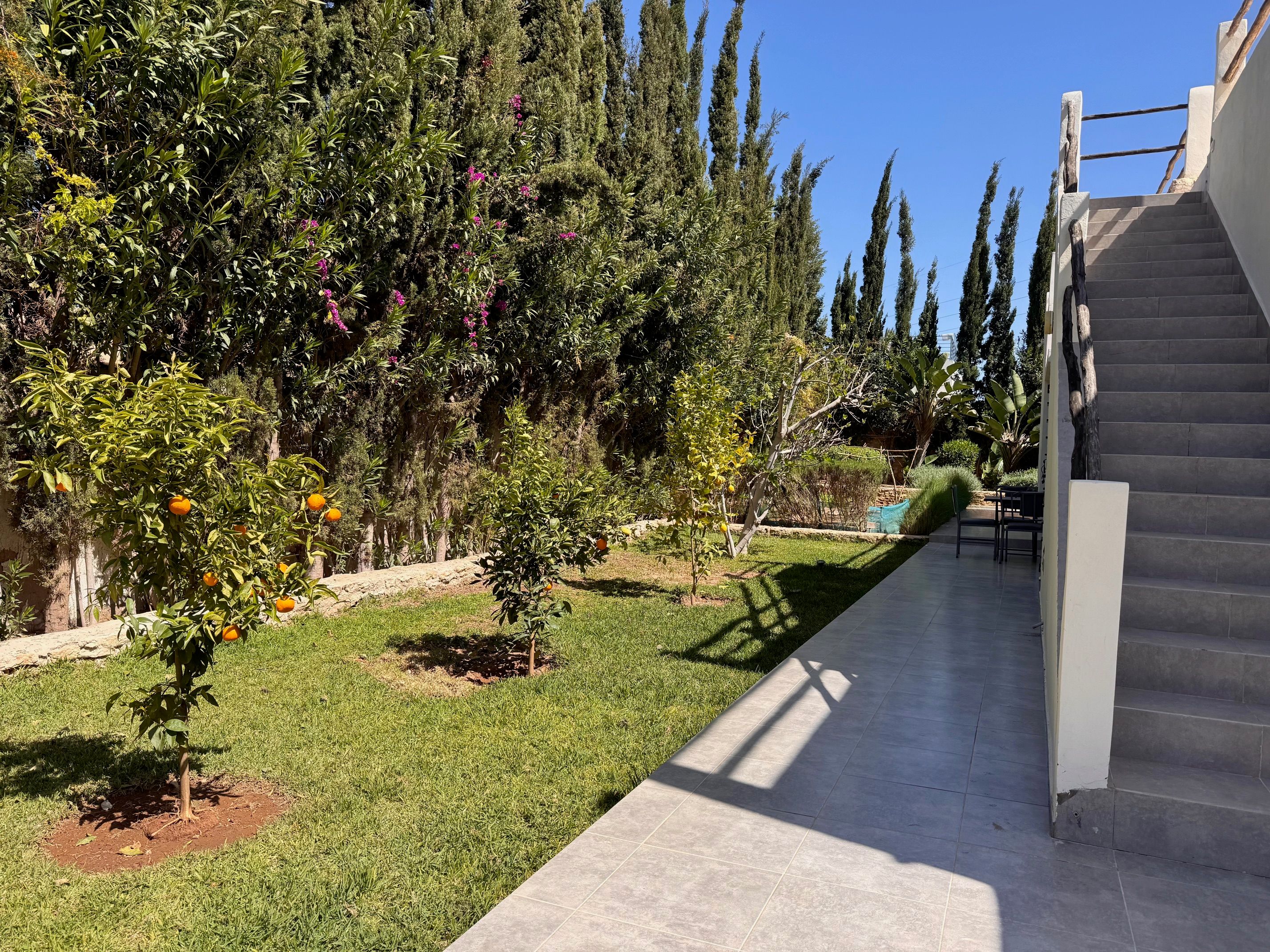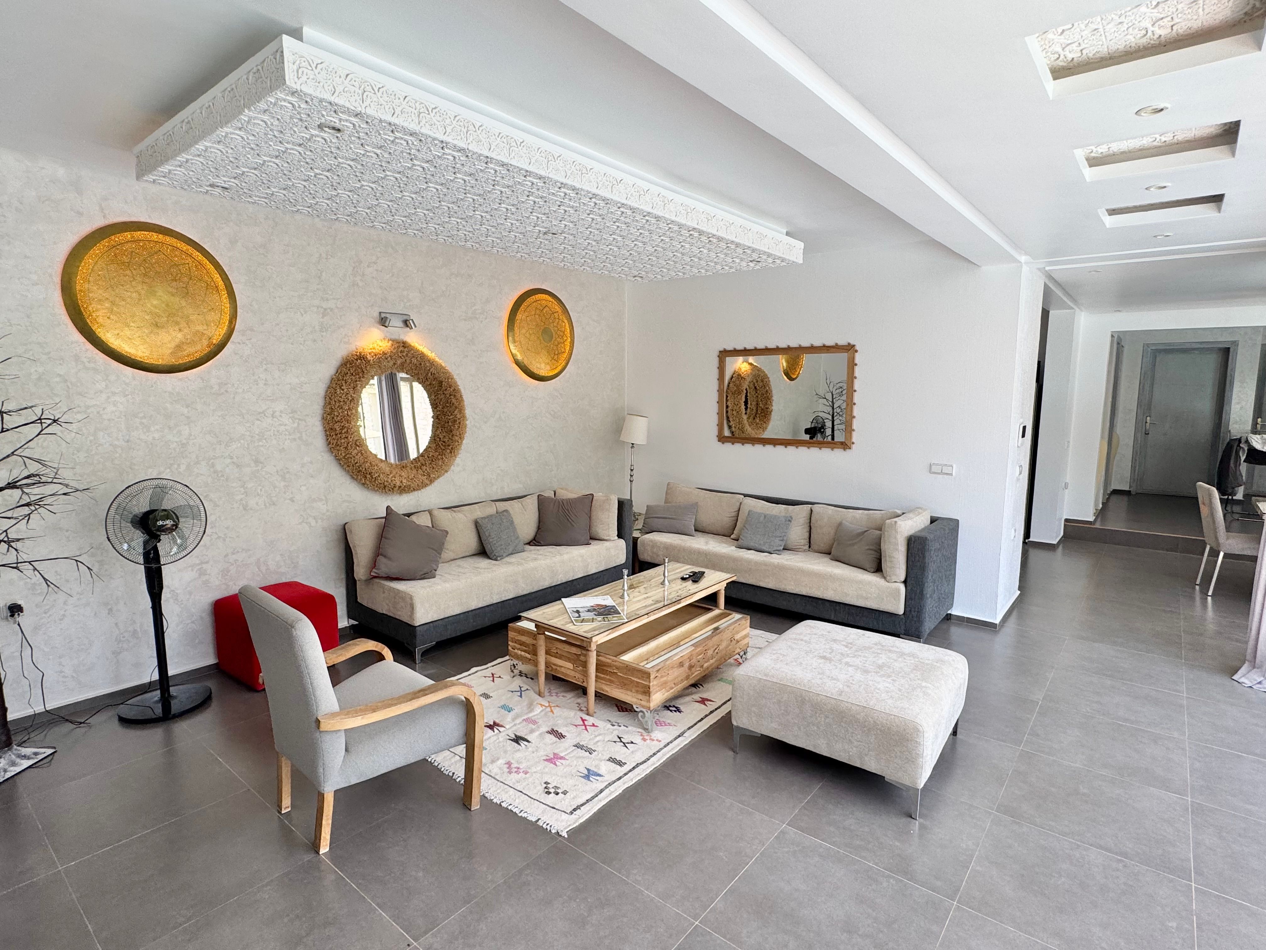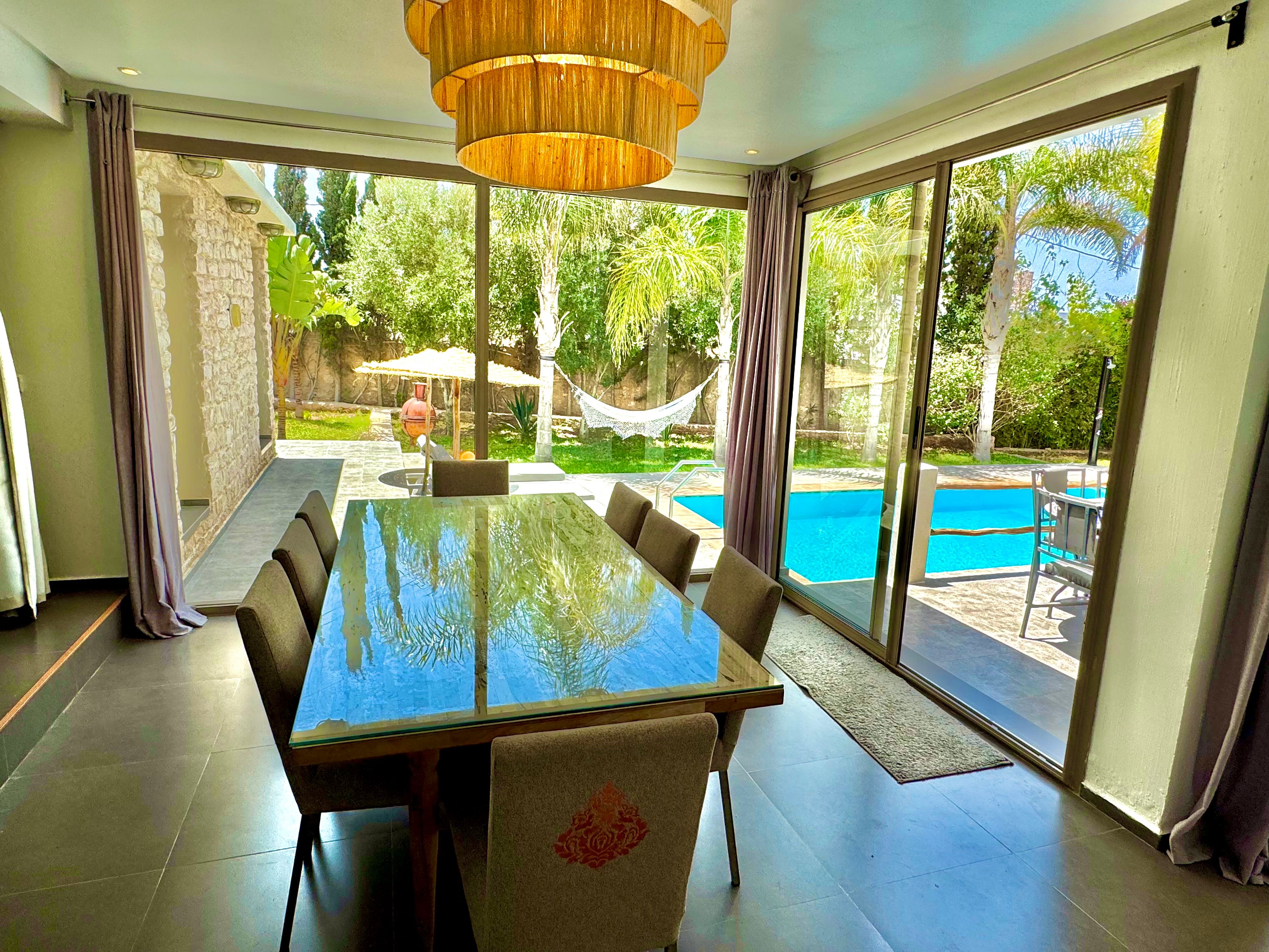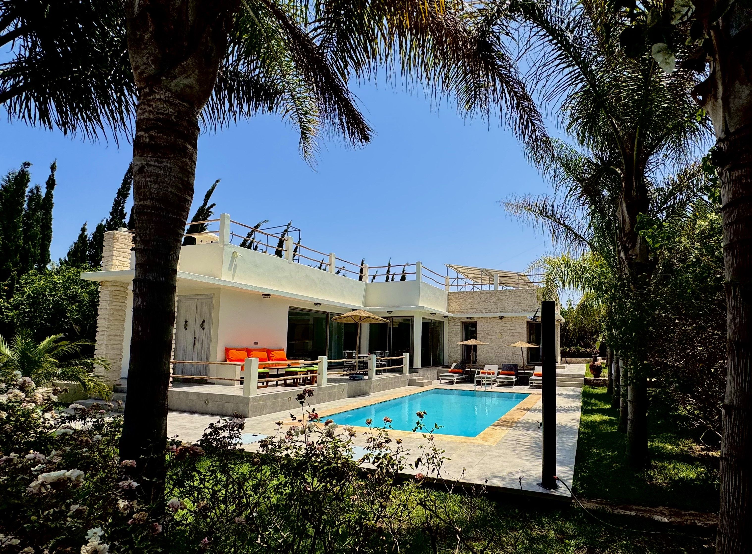 La Villa Mila à Essaouira est un hébergement de luxe et tout confort pour 6 personnes au cœur d'un jardin luxuriant, 3 chambres climatisées avec Tv satellite, 3 salles de bain, 4 WC, une cuisine super équipée et un salon moderne avec cheminée et télé multicanaux, Netflix... Elle offre un cadre idéal pour des familles ou des groupes d'amis avec des services complémentaires comme le ménage, les petits déjeuners, cuisine, massages à domicile, parking gratuit, et un accès proche des plages et des atmosphères magiques de la Médina: ses habitants, ses couleurs, ses restaurants, son artisanat, son port de pêche… et ses activités: golf, padel, kite surf, équitation, quad, excursions 4x4 et Renault4, hammams...